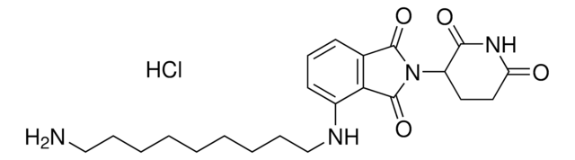 Protein degrader builiding block Pomalidomide-C9-NH2 hydrochloride enables the synthesis of molecules for targeted protein degradation and PROTAC (proteolysis-targeting chimeras) technology.This conjugate contains a Cereblon (CRBN)-recruiting ligand, a rigid linker, and a pendant amine for reactivity with a carboxylic acid on the target ligand. Because even slight alterations in ligands and crosslinkers can affect ternary complex formation between the target, E3 ligase, and PROTAC, many analogs are prepared to screen for optimal target degradation.When used with other protein degrader building blocks with a pendant amine, parallel synthesis can be used to more quickly generate PROTAC libraries that feature variation in crosslinker length, composition, and E3 ligase ligand.
