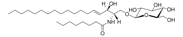C8 Glucosyl(β) Ceramide (d18:1/8:0) or D-glucosyl-β-1,1′-N-octanoyl-D-erythro-sphingosine has been used as a stock solution for the in vitro treatment of bacteria and to study the role of sphingolipids on pulmonary Pseudomonas aeruginosa infections in cystic fibrosis (CF). It may be suitable for the preparation of liposomes. It may also be used as a standard for the quantification of mitoxantrone in tumor by liquid chromatography-tandem mass spectrometry (LC-MS/MS).