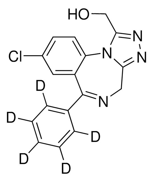 This stable-labeled internal standard is suitable for quantitation of α-hydroxyalprazolam levels in urine, serum, or plasma by LC/MS or GC/MS for urine drug testing, clinical toxicology, forensic analysis, or isotope dilution methods. α-Hydroxyalprazolam is a major urinary metabolite of alprazolam, a benzodiazepine drug approved to treat panic and other anxiety disorders including generalized or social anxiety disorder.
