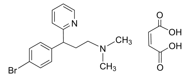 Brompheniramine is an over-the-counter antihistamine sold under the trade names Bromfed®, Dimetapp®, and Lodrane®. The drug is indicated for treatment of the common cold and allergic rhinitis symptoms including runny nose and itchy eyes. This Snap-N-Spike® Reference Solution is suitable for use as starting material in calibrators or controls for LC/MS or GC/MS methods in clinical toxicology, forensic analysis, and pharmaceutical research.