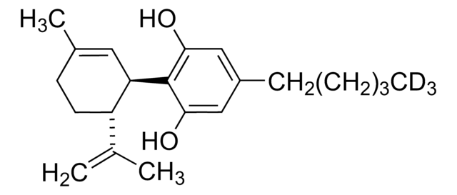 The Certified Spiking Solution® is suitable for quantitative testing of CBD by HPLC, GC/MS or LC-MS/MS methods in forensic analysis, clinical toxicology, urine drug testing, and cannabis potency or impurity profiling testing applications. The Certified Reference Material (CRM) in solution can also be used as an internal standard in the following: