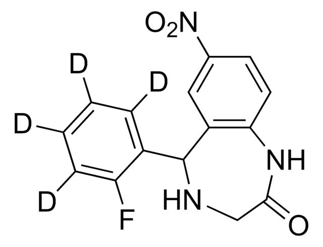 Certified Spiking Solutions® and internal standards are suitable for isotope dilution methods or for quantitation of N-desmethylflunitrazepam levels in LC/MS or GC/MS testing methods. N-Desmethylflunitrazepam, also known as norflunitrazepam, is a major urinary metabolite of flunitrazepam. Flunitrazepam is an intermediate-acting benzodiazepine marketed under the trade name Rohypnol as a hypnotic, sedative, anticonvulsant and skeletal muscle relaxant.