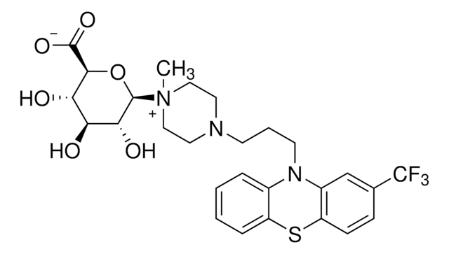 Trifluoperazine N-β-D-glucuronide is a urinary and blood metabolite of trifluoperazine, a typical antipsychotic used for treating schizophrenia. Trifluoperazine is also indicated for use in patients with agitation, severe anxiety, or behavioral problems. This Snap-N-Spike®; reference material is suitable for use as a hydrolysis control in mass spectrometry-based testing applications of trifluoperazine in clinical toxicology, forensic analysis, therapeutic drug monitoring, and urine drug testing.