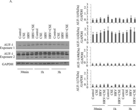 A+U Rich RNA Binding Factor (AUF1) is comprised of four isoforms of 37, 40, 42, and 45 kDa. Although the role of each isoform has yet to be fully characterized, a direct correlation has been observed between each AUF1 isoform’s binding affinity and its RNA destabilizing activity toward different AREs (A + U rich element in the 3’ untranslated region), with the isoforms p37 and p42 being the most effective.