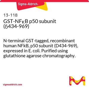 N-terminal GST-tagged, recombinant human NFkB, p50 subunit (D434-969), expressed in E. coli. Purified using glutathione agarose chromatography. MW = 74kDa.