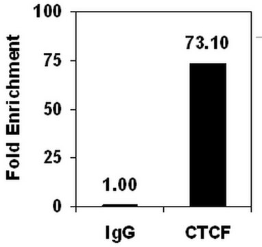 使用2 µg正常小鼠IgG或2 µg抗CTCF和Magna ChIP® G试剂盒(目录编号17-611)对从HeLa细胞制备的超声染色质(每个IP 1 X 106细胞当量,固定15分钟)进行染色质免疫沉淀。 使用ChIP引物人H19 ICR通过qPCR验证了CTCF相关DNA片段的成功免疫沉淀(请参见图)。