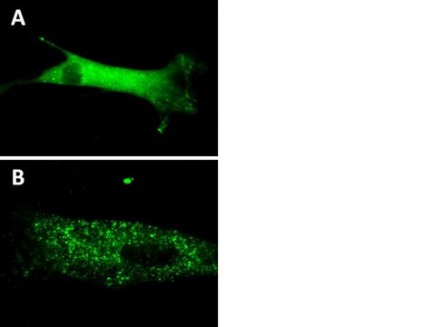 Similar to Figure 1 (see datasheet), U2OS cells were plated in a chamber slide and transduced with GFP-p62 lentiviral particles at an MOI of 40 for 24 hours. After 24 hours, media was replaced and cells were then further incubated for 24 hours. The cells were then fixed and stained with a polyclonal antibody against p62 (Cat. No. MABC32), followed by a Cy3-conjugated anti-rabbit IgG. Distribution of the GFP-p62 (green) is similar to that detected by immunocytochemical staining (red).