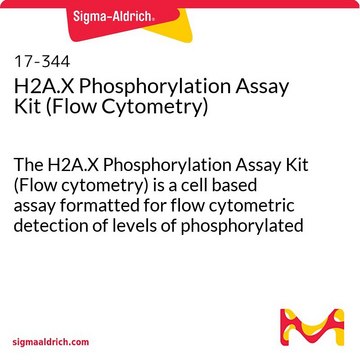 H2A.X磷酸化检测试剂盒(流式细胞仪)是一种基于细胞的检测试剂盒,用于流式细胞术检测磷酸化组蛋白H2A.X的水平。在微孔板中培养细胞,并用诱导DNA损伤或凋亡(刺激H2A.X磷酸化)的试剂处理。然后将细胞固定并透化,以准备染色和检测。通过添加抗磷酸组蛋白H2A.X,FITC结合物来检测在丝氨酸139处磷酸化的组蛋白H2A.X。 然后在流式细胞仪中扫描细胞以定量磷酸化组蛋白H2A.X染色阳性的细胞数量。