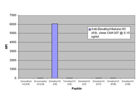 This antibody specifically recognizes histone H3 dimethylated on Lys9 by Luminex assay.