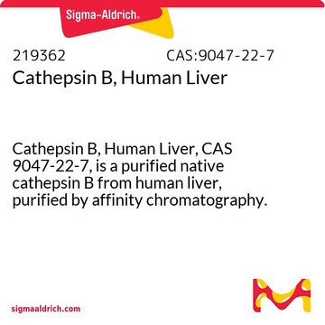 来自人肝脏、通过亲和色谱和HPLC纯化的天然组织蛋白酶B。全部溶酶体半胱氨酸蛋白酶研究最多的酶。组织蛋白酶B属于木瓜蛋白酶样半胱氨酸蛋白酶家族,是一种前酶原。它是一种双叶形蛋白(bilobal protein),催化位点位于两叶之间的界面。
