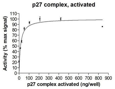 p27 is an important regulator of cell cycle progression, involved in G1 arrest. It is a potent inhibitor of cyclin E1- and cyclin A-CDK2 complexes and a positive regulator of cyclin D-dependent kinases such as CDK4. The degradation of this protein, which is triggered by its CDK-dependent phosphorylation and subsequent ubiquitination by SCF complexes, is required for the cellular transition from quiescence to the proliferative state. Decreased levels of p27 are found in various epithelial tumours originating from lung, breast, colon, ovary, oesophagus, thyroid and prostate. Defects in the gene encoding p27 (CDKN1B) are the cause of multiple endocrine neoplasia type 4 (MEN4) an inherited cancer of the thyroid.