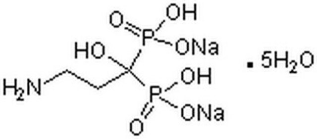 A potent and specific inhibitor of bone resorption that does not cause any significant detrimental effect on bone growth and mineralization at concentrations used. Effective in a variety of conditions characterized by pathologically enhanced bone turnover, including Paget’s disease, hypercalcaemia of malignancy, osteolytic bone metastasis, steroid-induced osteoporosis, and idiopathic osteoporosis. Inhibits breast cancer cell growth by inducing cell death in vitro. Provided in hydrated form, contains five molecules of water.