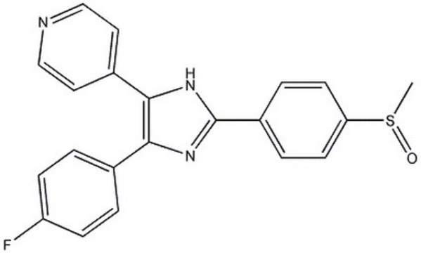 A highly specific, cell-permeable inhibitor of p38 kinase (IC50 = 34 nM in vitro, 600 nM in cells). Also known as reactivating kinase (RK) and CSBP (cytokine synthesis anti-inflammatory drug binding protein). Does not significantly inhibit JNK or p42 MAP kinase even at 100 µM. Inhibits IL-1 and TNF-α production from LPS-stimulated human monocytes and the human monocyte cell line THP-1 (IC50 = 50-100 nM). SB 203580 has also been shown to be an effective inhibitor of inflammatory cytokine production in vivo in both mice and rats.