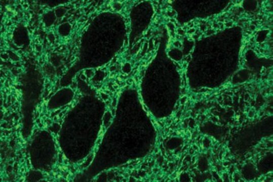雄性Sprague-Dawley大鼠(b.wt.100-150g)用戊巴比妥钠麻醉,并通过升主动脉灌注50 mL不含Ca2+的Tyrode+s溶液,然后灌注福尔马林-苦味酸固定剂(含0.4%苦味酸的4%多聚甲醛的0.16 M磷酸盐缓冲液,pH 6.9)6分钟。快速解剖组织,在相同的固定剂中固定90分钟,然后在含有10%蔗糖的0.1 M磷酸盐缓冲液(pH 7.4)中冲洗至少24小时。将切片在低温恒温器中切割(14 um),并在4°C下与AB1783(1:5,000-1:10,000)孵育过夜。在PBS中漂洗后,将切片与Cy3偶联的二抗在室温下孵育60分钟。固定在含有0.1%对苯二胺的PBS和甘油(1:3)的混合物中后,用Nikon Microphot-SA落射荧光显微镜检查切片。