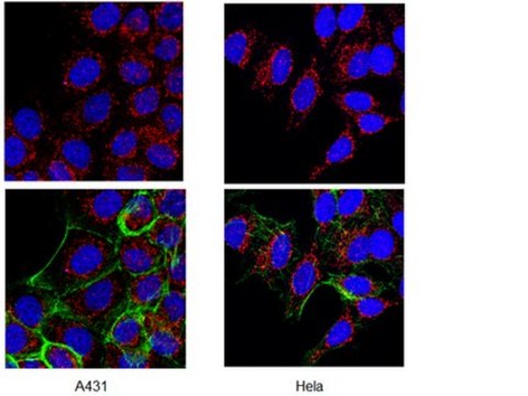 免疫细胞化学分析: 使用兔抗 ADAM 17 多克隆抗体对 A431 进行共聚焦荧光分析。
