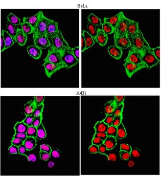 Immunocytochemistry Analysis: 1:500 dilution from a representative lot detected Sp1 in HeLa and A431 cells.