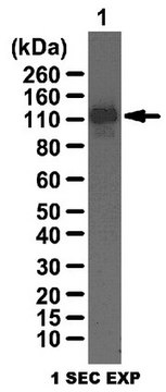 ~110 kDa observed. Uniprot describes two isoforms at ~92 kDa and ~95 kDa due to alternative splicing.