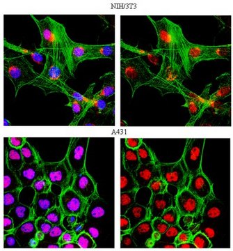 免疫细胞化学分析: 一个先前批次的1:500稀释液在NIH/3T3、A431、C2C12和 HeLa细胞中检测到细胞周期素D。
