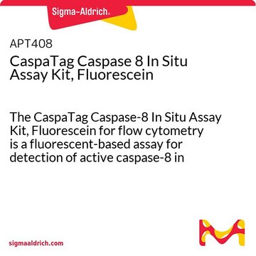 CHEMICON′s CaspaTag Caspase-8 In Situ Assay Kits use a novel approach to detect active caspases. The methodology is based on Fluorochrome Inhibitors of Caspases (FLICA). The inhibitors are cell permeable and non-cytotoxic. Once inside the cell, the inhibitor binds covalently to the active caspase7. This kit uses a carboxyfluorescein-labeled fluoromethyl ketone peptide inhibitor of caspase-8 (FAM-LETD-FMK), which produces a green fluorescence. When added to a population of cells, the FAM-LETD-FMK probe enters each cell and covalently binds to a reactive cysteine residue that resides on the large subunit of the active caspase heterodimer, thereby inhibiting further enzymatic activity. The bound labeled reagent is retained within the cell, while any unbound reagent will diffuse out of the cell and is washed away. The green fluorescent signal is a direct measure of the amount of active caspase-8 present in the cell at the time the reagent was added. Cells that contain the bound labeled reagent can be analyzed by 96-well plate-based fluorometry, fluorescence microscopy, or flow cytometry.