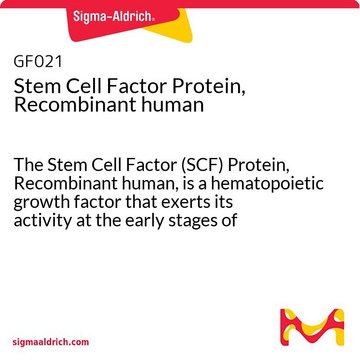 Stem Cell Factor (SCF) is a hematopoietic growth factor that exerts its activity at the early stages of hematopoiesis. SCF stimulates the proliferation of myeloid, erythroid, and lymphoid progenitors in bone marrow cultures and has been shown to act synergistically with colony stimulating factors. Recombinant human SCF is an 18.4 kDa protein containing 165 amino acid residues corresponding to the soluble secreted form of SCF.
