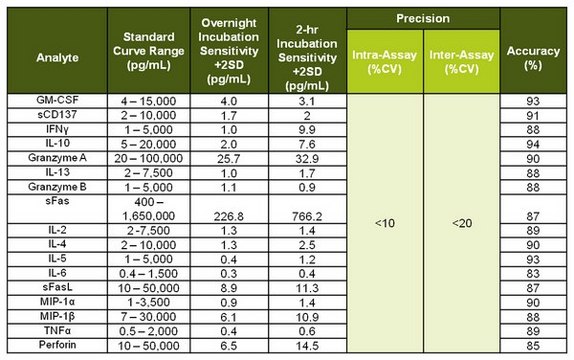 Analytes included: GM-CSF, sCD137, IFNγ, sFas, sFasL, Granzyme A, Granzyme B, IL-2, IL-4, IL-5, IL-6, IL-10, IL-13, MIP-1α, MIP-1β, TNF-α, Perforin