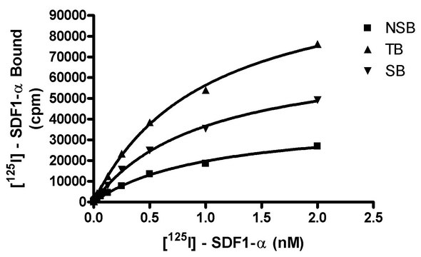 The chemokine SDF-1a and its GPCR receptor CXCR4 have a one-to-one specificity that is unique among chemokines and their receptors. SDF-1a binds to CXCR4 expressed on hematopoietic and lymphopoietic cells, and directs their trafficking to and retention in hemato-and lymphatopoietic organs and sites of inflammation (Kucia et al., 2004). CXCR4 is expressed on several tumor cell lineages, and might be responsible for metastasis to sites of SDF-1a expression, such as bone and lymph nodes (Muller et al., 2001). In addition, CXCR4 is a coreceptor for the HIV envelope glycoprotein gp120 (Feng et al., 1996). Small molecule antagonists of CXCR4 have been developed and shown to inhibit infectivity of T-tropic HIV strains and to impair growth of brain tumors (Arakaki et al., 1999; Rubin et al., 2003). Chemicon′s CXCR4 membrane preparations are crude membrane preparations made from our proprietary stable recombinant cell lines to ensure high-level of GPCR surface expression; thus, they are ideal tools for screening for antagonists of interactions between CXCR4 and SDF-1a. Radiolabeled SDF-1a binds to the CXCR4 membranes with a Kd of 0.9 nM. With 0.04-0.13 nM 125I-labeled SDF-1a, an approximately 3-fold window of specific binding is obtained.