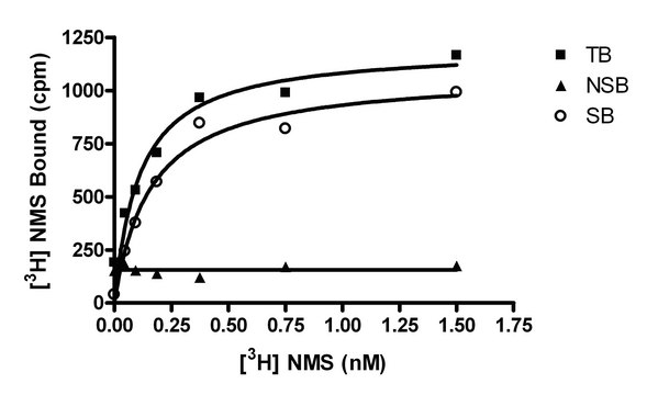 Membranes are mixed with radioactive ligand and unlabeled competitor (see Figures 1 and 2 for concentrations tested) in binding buffer in a nonbinding 96-well plate, and incubated for 1-2 h. Prior to filtration, a GF/C 96-well filter plate is coated with 0.33% polyethyleneimine for 30 min, then washed with 50mM HEPES, pH 7.4, 0.5% BSA. Binding reaction is transferred to the filter plate, and washed 3 times (1 mL per well per wash) with Wash Buffer. The plate is dried and counted. Binding buffer: 50 mM Hepes, pH 7.4, 5 mM MgCl2, 1 mM CaCl2, 0.2% BSA, filtered and stored at 4°C Radioligand: [3H] NMS (Perkin Elmer#:NEX-636 )