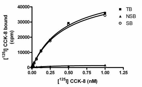 One package contains enough membranes for at least 200 assays (units), where a unit is the amount of membrane that will yield greater than 20-fold signal:background with 125I labeled CCK-8 at 0.3 nM