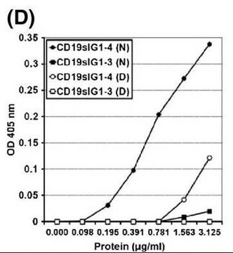 根据比较研究、抗原识别和与CD19转染细胞系的阳性反应,该抗体的特异性与CD19单克隆抗体相当(Zola et al.,1988,1989)。可检测人B细胞系(包括前B细胞)表面的96 kD单链糖蛋白。外周血和组织中可检出B细胞。该抗体与大多数B细胞恶性肿瘤反应,包括慢性淋巴细胞白血病和大多数淋巴瘤,但不与多发性骨髓瘤反应。
