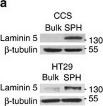 蛋白质印迹分析:该抗体以1:500-1:2000稀释度在10µ g人重组层粘连蛋白5中检测到层粘连蛋白5,γ2链。