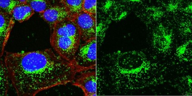 Immunocytochemistry Analysis: A 1:500 dilution from a representative lot detected LAMP-1 in HeLa and A431 cells.