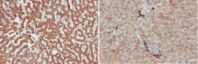 Immunohistochemistry (Paraffin) Analysis: A 1:50 dilution from a representative lot detected Retinal Dehydrogenase 1/ALDH1A1 in human liver and rat liver tissue sections.