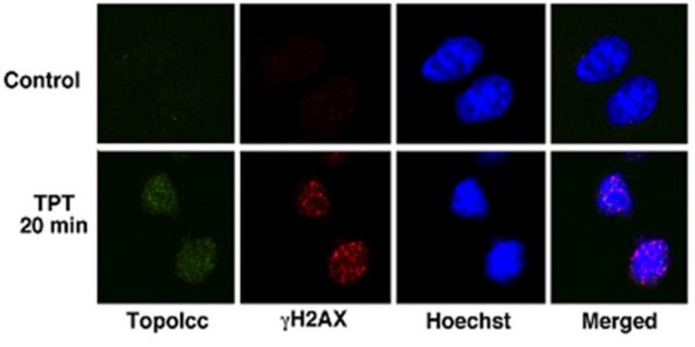 免疫细胞化学分析:10 µg/mL代表性批次产品在拓扑替康处理的A549人肺癌细胞中检测到拓扑异构酶I/DNA共价复合物(由明尼苏达州罗切斯特市梅奥诊所的Scott H. Kaufmann博士提供)。