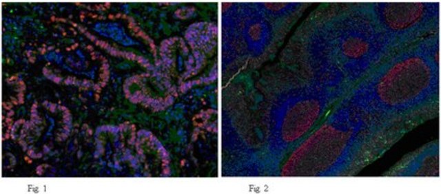 免疫荧光分析:一个代表性批次以1:1,500稀释度在人淋巴结和人结肠腺癌细胞中检测到PCNA。
