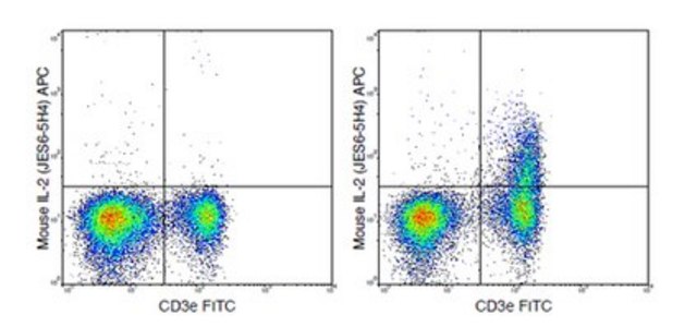 Flow Cytometry Analysis: 0.06 μg from a representative lot detected IL-2 in one million C57Bl/6 splenocytes.