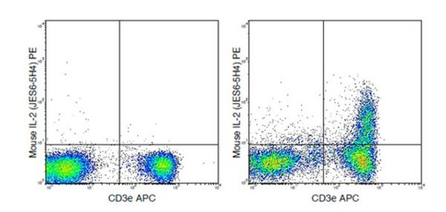Flow Cytometry Analysis: 0.06 μg from a representative lot detected IL-2 in one million C57Bl/6 splenocytes.