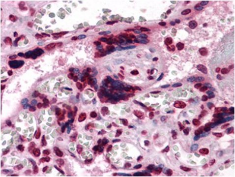 Macrophage colony stimulating factor 1 (CSF1,CSF-1, M-CSF, MCSF) or Lanimostim is a cytokine that was first identified as a molecule that plays an important role in the survival, proliferation and differentiation of mononuclear cells such as phagocytes, macrophages and monocytes. Today however we know that CSF1 also serves several other functions in a variety of cell types. CSF1 is essential for normal bone development, osteoclast proliferation, and the resorption of bone. CSF1 is released by osteoclasts upon stimulation by parathyroid hormone. Additionally CSF1 impacts actin and cytoskeleton reorganization which effects cell adhesion and migration, and overstimulation of CSF1 in endothelial cells is linked to the development and progression of atherosclerosis. CSF1 is also highly expressed in the endometrial epithelium of the pregnant uterus and CSF1 is essential for normal embryonic implantation and placental development. CSF1 appears to play an important role in cancer as well; first CSF1 is an anti-tumor agent and increases macrophage expression of anti-tumor activity, but over expression of CSF1 in breast, bone, and several other forms of cancer appears to promote cell invasiveness, proliferation, and tumor survival. Finally, CSF1 as a secreted mature factor promotes the release of proinflammatory cytokines and serves as part of the innate immunity process for inflammation and infection. CSF1 is initially produced as a precursor that is membrane bound but processed and secreted upon stimulation. CSF1 is heavily glycosylated and found both in the ECM as well as surface membranes of cells. CSF1 receptor is found on numerous cell types including macrophages, endothelial cells, and osteoclasts. EMD-Millipore’s Anti-CSF1 mouse monoclonal antibody has been tested in western blot on recombinant protein and in paraffin embedded immunohistochemistry on human placental tissue sections.