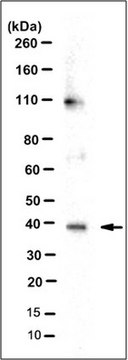 观测分子量〜38 kDa。某些裂解物中可能会出现未表征的条带。