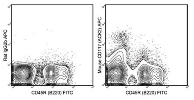 流式细胞术分析: 0.06 µg该抗体在100万个C57BI/6骨髓细胞中检测到CD117。