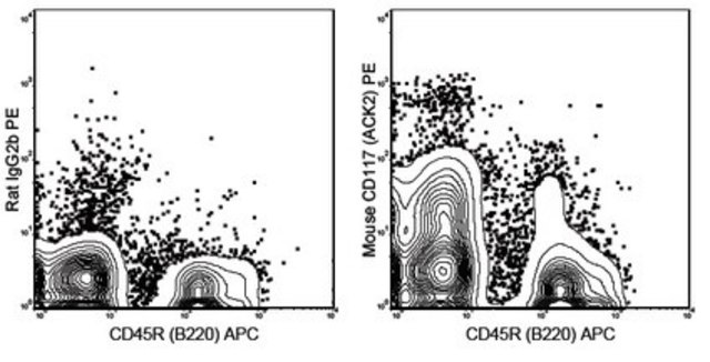 Flow Cytometry Analysis: 0.06 µg of this antibody detected CD117 (c-kit) in one million C57Bl/6 bone marrow cells.