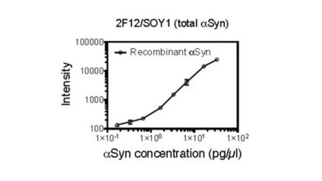 ELISA Analysis: A representative lot (0.4 µL in 30 µL buffer/well for coating) captured recombinant human α-synuclein (0.2-40 ng/mL) in a sandwich ELISA application utilizing clone SOY1 (Cat. No. MABN1818; preconjugated with Sulfo tag) as the detection antibody (Courtesy of Tim Bartels, Ph.D., Brigham and Women′s Hospital, Boston, MA, U.S.A.).