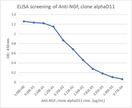 Anti-Nerve Growth Factor, clone D11, Cat. No. MABN2322, is a rat monoclonal antibody that detects Nerve growth factor and is tested for use in ELISA, Inhibition Assay, Radioimmunoassay, and Surface Plasmon Resonance.