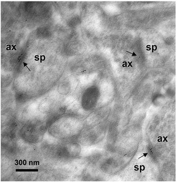 电子显微镜分析:一个代表性批次在大鼠海马中检测到AMPA受体(GluR1-4)(由Mount Sinai School of Medicine的John Morrison博士提供)。