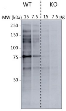 蛋白质印迹分析:1.0 µg/mL样品的代表性批次在7.5-15 µg野生型小鼠胚胎成纤维细胞(MEF)裂解物中检测到O-GlcNAc糖基化蛋白,但未检测到O-GlcNAc转移酶/OGT缺陷型MEF裂解物(由Dr.Natasha Zachara和Gokben Yildirir,M.S.提供)。