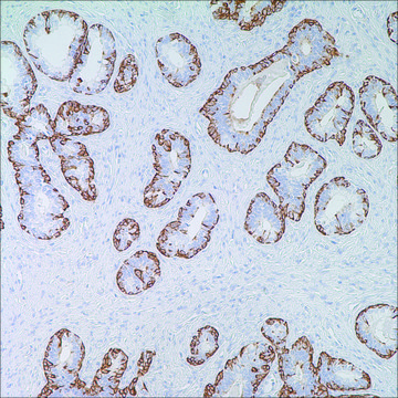 Anti-Cytokeratin, 34betaE12 is an antibody to high molecular weight cytokeratin that reacts with all squamous and ductal epithelium and stains carcinomas. This antibody recognizes cytokeratins 1,5,10, and 14 that are found in complex epithelia. Anti-Cytokeratin, 34betaE12 shows no reactivity with hepatocytes, pancreatic acinar cells, proximal renal tubules, or endometrial glands; there has been no reactivity with cells derived from simple epithelia. Mesenchymal tumors, lymphomas, melanomas, and neural tumors are unreactive with this antibody with some exceptions. Anti-Cytokeratin, 34betaE12 does label myoepithelial cells and has been shown to be useful in distinguishing prostatic adenocarcinoma from hyperplasia of the prostate. This antibody has also been useful in separating benign from malignant intraductal breast proliferations.