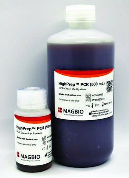 pkg of 250 mL (AC-60250 (HighPrep™ PCR (250 mL))), pkg of 5 mL (AC-60005 (HighPrep™ PCR (5 mL))), pkg of 50 mL (AC-60050 (HighPrep™ PCR (50 mL))), pkg of 500 mL (AC-60500 (HighPrep™ PCR (500 mL)))
