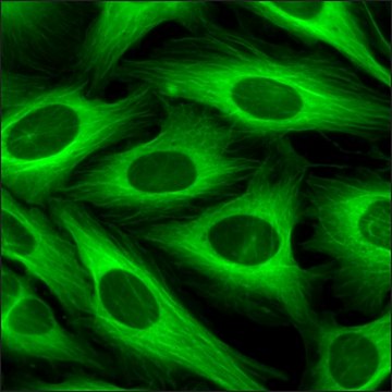 This product is a human U2OS cell line in which the genomic TUBA1B gene has been endogenously tagged with a Green Fluorescent Protein (GFP) gene using CompoZr® Zinc Finger Nuclease technology. Integration resulted in endogenous expression of the fusion protein in which GFP is attached to the N-terminus of tubulin. Fluorescence imaging shows that the tubulin can polymerize to form the characteristic pattern of microtubules. Addition of vincristine to this cell line shows the expected depolymerization of microtubules. This stable cell line was expanded from a single clone. The target′s gene regulation and corresponding protein function are preserved in contrast to cell lines with overexpression via an exogenous promoter.