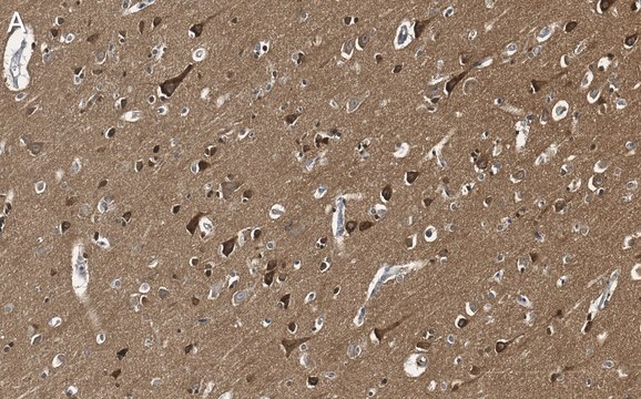 Western Blotting Analysis: A 1:1,000 dilution of this antibody detected Tau in Human Brain tissue lysate.Tested applicationsImmunocytochemistry Analysis): A 1:100 dilution from a representative lot detected Tau in SH-SY5Y cells.Immunohistochemistry (Paraffin) Analysis: A 1:100 dilution from a representative lot detected Tau in human cerebral cortex tissue sections.Affinity Binding Assay: A representative lot of this antibody bound Tau peptide with a KD of 9.0 x 10-6 in an affinity binding assay.Note: Actual optimal working dilutions must be determined by end user as specimens, and experimental conditions may vary with the end user