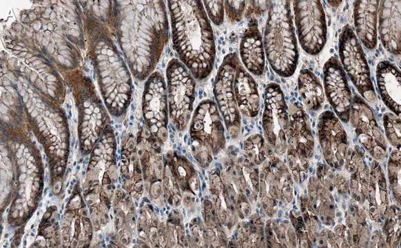 Immunohistochemistry (Paraffin) Analysis: A 1:100 dilution from a representative lot detected Cortactin in human stomach tissue sections.