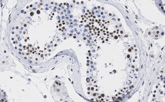 Immunohistochemistry (Paraffin) Analysis: A 1:100 dilution from a representative lot detected DAXX in human testis tissue sections.